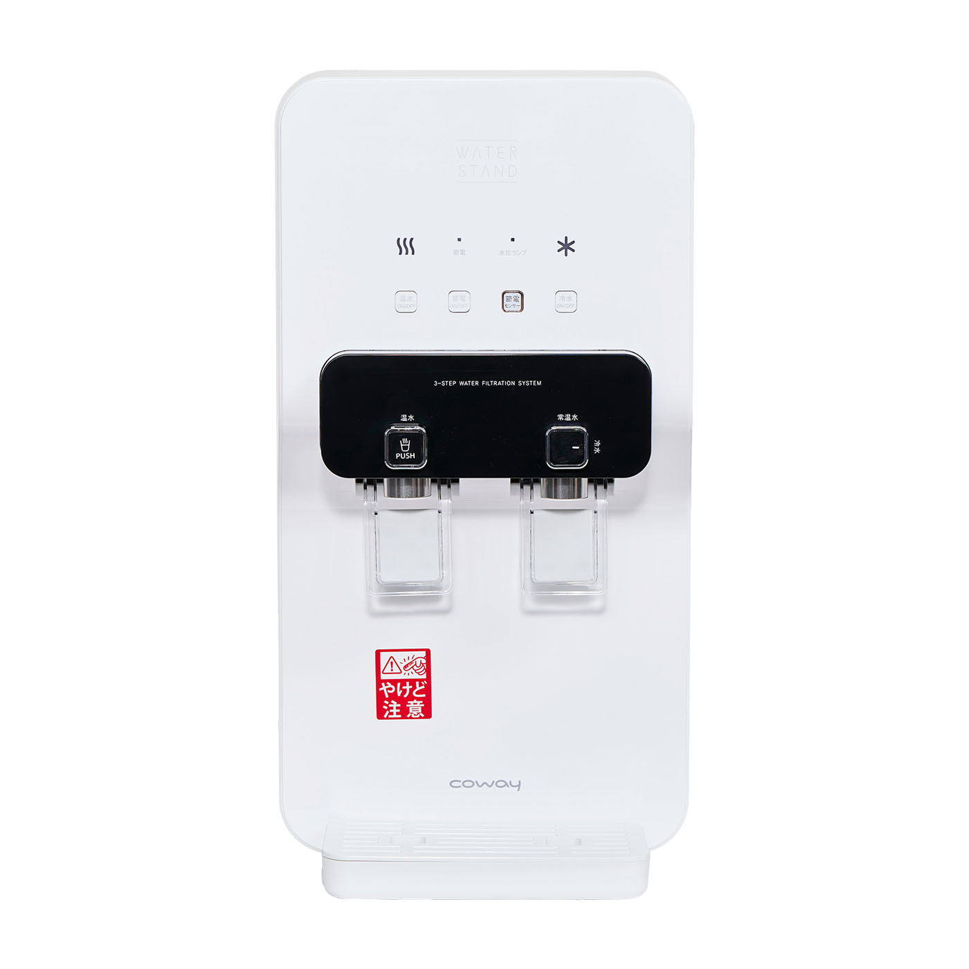 ウォータースタンドが展開する「ピュアライフ S」は、2025年に発売された給水型の浄水ウォーターサーバーです。設置工事が不要で、キッチンやリビングなど好きな場所に設置できる省スペースモデル。冷水・常温水・温水の3温度に対応しており、3段階の定量抽出機能も備えています。浄水性能は非常に優れており、JIS規格と浄水器協会で定められた除去対象22物質のうち21項目の不純物を除去可能。出水口にはUV殺菌機能も搭載されています。500mLペットボトルが収まる設計で注ぎやすく、トレイをタンクから外して清掃できる点も魅力です。契約期間の縛りがなく、コストを抑えつつ導入したい人にも適しています。ただし、水道直結型ではないため、タンクへの給水作業は必要です。冷水・給水タンク自体には殺菌機能がありませんが、常温水タンクと出水口には殺菌機能がついています。卓上型で好きな高さに設置できるうえ、コストもかなり安いので、日常使いしやすい浄水型ウォーターサーバーを探している人におすすめの商品といえます。どの浄水型ウォーターサーバーを選ぶか迷う人にとって第一候補になるでしょう。