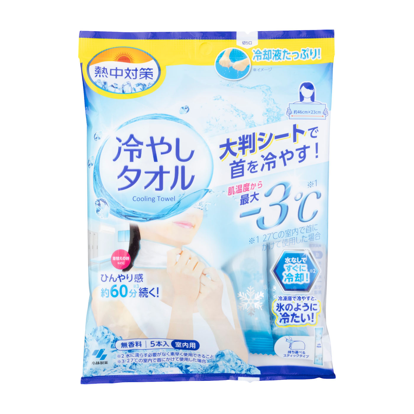 小林製薬の「熱中対策 冷やしタオル」は、使い切りのシートタイプで、手軽に冷たさを感じられる商品です。冷却力の検証では、首の後ろの表面温度を着用から2分後は平均-2.50℃、着用から30分後は平均-0.78℃下げることができました。30分後の冷却力は落ちますが、暑い日に冷感タオルを使うことで、やや涼しいと感じられるほどには肌表面を冷やすことができます。使い心地の検証では、メントールによるひんやり感は続くものの「少し痛いヒリヒリとした冷たさがある」と、刺激の強さが気になりました。肌が刺激に弱い人は注意が必要です。タオルの長さが46cmと短めで、着用時に服が濡れにくい点はメリットと言えます。肌が刺激に弱い人には不向きですが、外出先で手間をかけずに冷たさを得たい人や、服を濡らしたくない人にはおすすめの商品です。