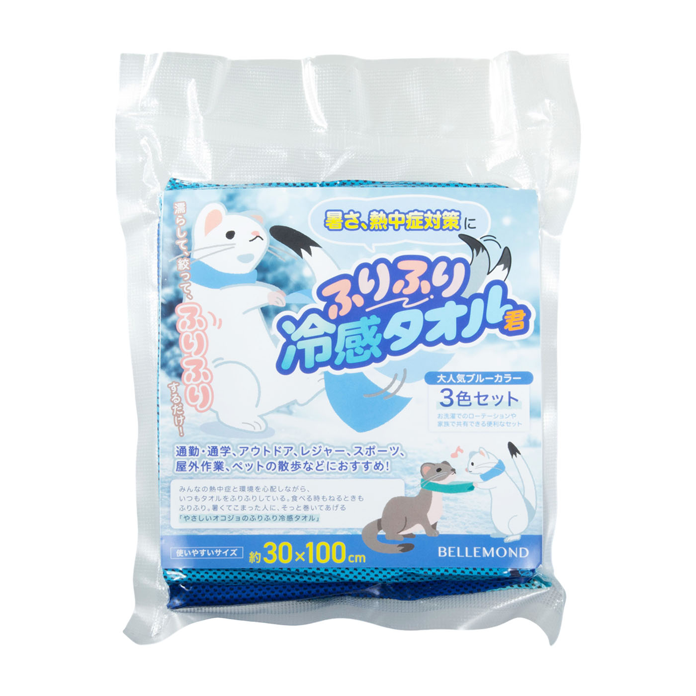 Fun Standardが展開する「BELLEMOND ふりふり冷感タオル君」は、水で濡らして数秒振るだけで冷たくなる、気化熱を利用した冷感タオルです。冷却力の検証では、着用から2分後の首の後ろの表面温度変化は平均で-2.02℃と、首に当てた直後からヒヤッとするはっきりとした冷たさで表面温度を下げることができました。また、着用から30分後の首の後ろの表面温度も平均-1.14℃下がっていたうえ、振れば何度でも冷却力を復活させられるため、暑い日に長時間外出する際におすすめです。表面温度はしっかり下がった一方で、使い心地のよさの検証では一部のモニターから「30分後はひんやり感はほぼなく、ぬるい」「タオルの端が当たった場所が濡れて気持ち悪い」という指摘も。肌に当てたときのひんやり感や気持ち悪さには個人差がありました。また、使用前に洗濯をしたところ色移りはしませんでした。使用前にメーカー指定の方法で洗濯をするとよいでしょう。濡らして振るだけで高い冷却効果を得られるため、スポーツ観戦や屋外作業など、暑さ対策に使いたい人向けの冷感タオルです。
