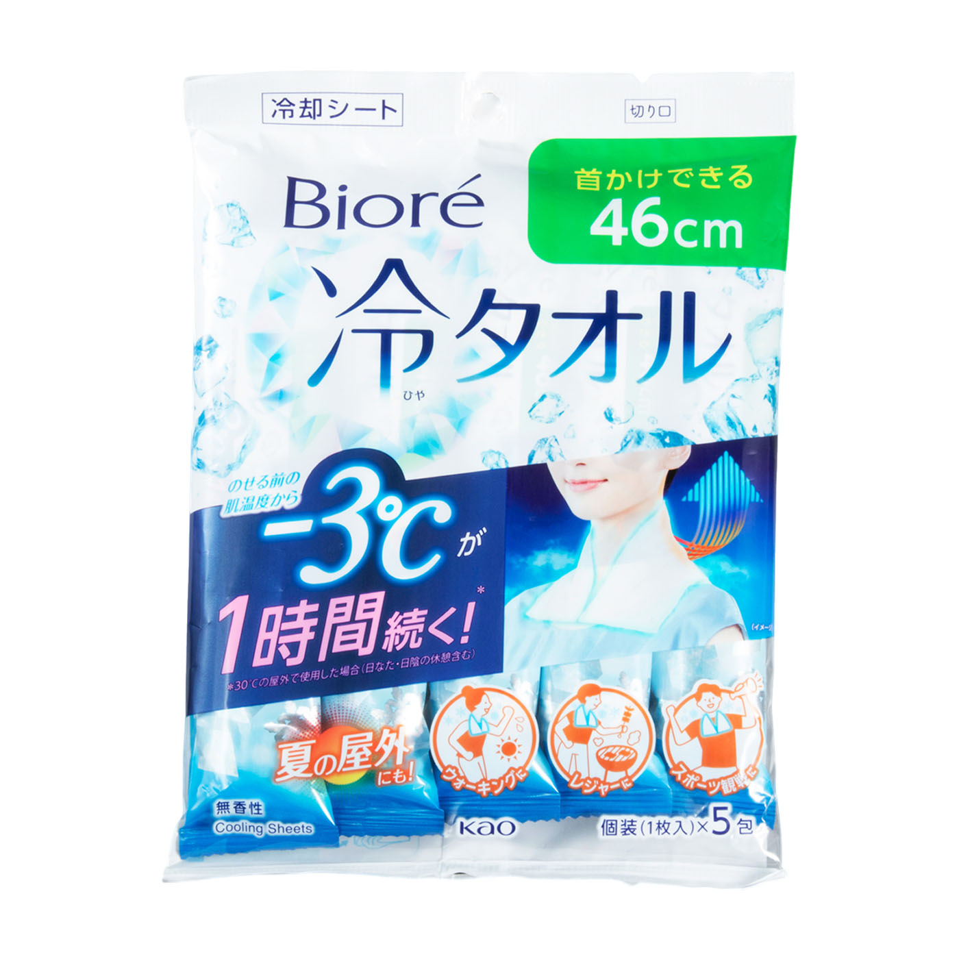 花王が展開する「ビオレ 冷タオル」は、使い切りシートタイプの商品です。ドラッグストアやコンビニでも購入しやすく、5本入りで1,000円以下と安価な点が魅力です。冷却力の検証では、首の後ろの表面温度は着用開始から2分後で平均-1.78℃、着用開始から30分後で平均-0.52℃の温度低下が確認されました。首に当てた直後ははっきりと冷たさと涼しさを実感できますが、時間とともに冷却力は低くなる結果に。シートタイプのため、冷却力が復活しないのも難点です。使い心地の検証では、メントールによるひんやり感が評価されました。シートタイプ特有の肌への刺激に関しても、「爽快感はあるがヒリヒリ感は少ない」といったコメントが寄せられました。長さが46cmと短いことで服が濡れる不快感も少ないため、ストレスなく使える点が魅力です。移動中にサッと取り出して首元を冷やしたい人や、肌や服を濡らさずに使いたい人に向いた冷感タオルです。