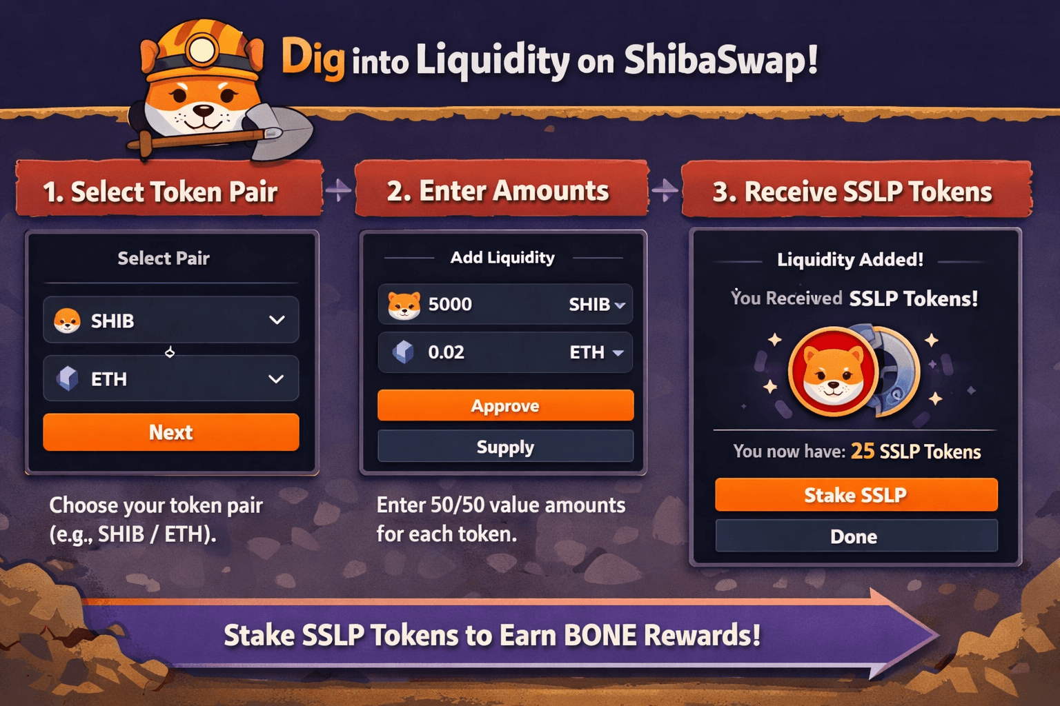 • Dig (Liquidity Provision): Add token pairs to pools (e.g., SHIB/ETH) to receive LP tokens (SSLP), then stake them for BONE via Woof or similar features.