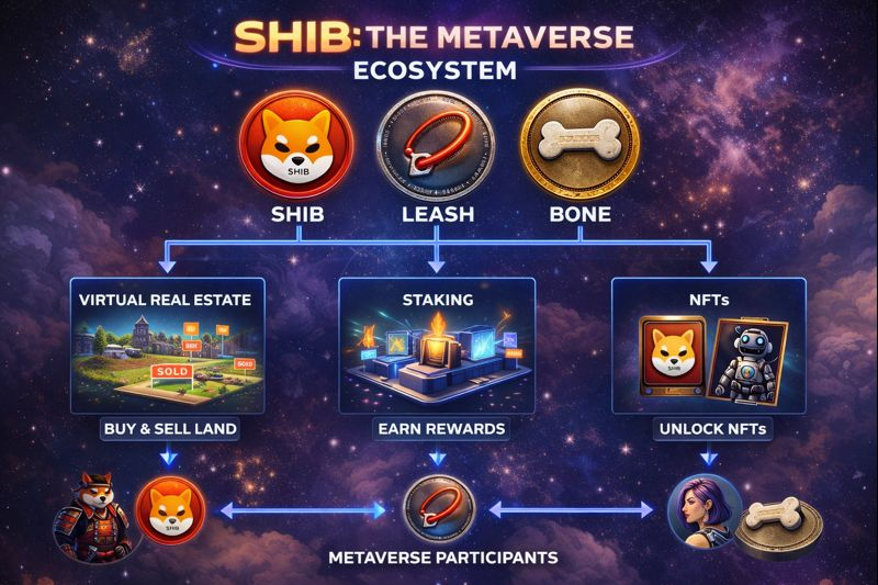 • Metaverse Utility: Integrates SHIB, LEASH, and BONE as in-game assets, enabling transactions, land ownership, and governance.