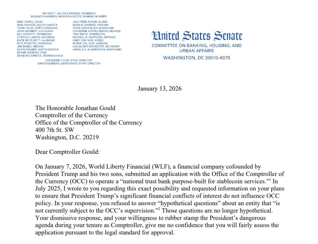 Warren, the ranking Democrat on the Senate Banking Committee, said the situation was no longer hypothetical after a World Liberty subsidiary formally applied on January 7, 2026, to operate a national trust bank designed to support stablecoin services.