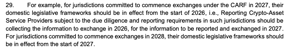 經合組織在 11 月的一份更新報告中表示,越來越多的司法管轄區承諾在 2027 年開始根據 CARF 框架交換信息,這些司法管轄區已經制定了必要的立法,強制加密服務提供商收集與 CARF 相關的數據,或者正處於執行這些法律的「最後階段」。