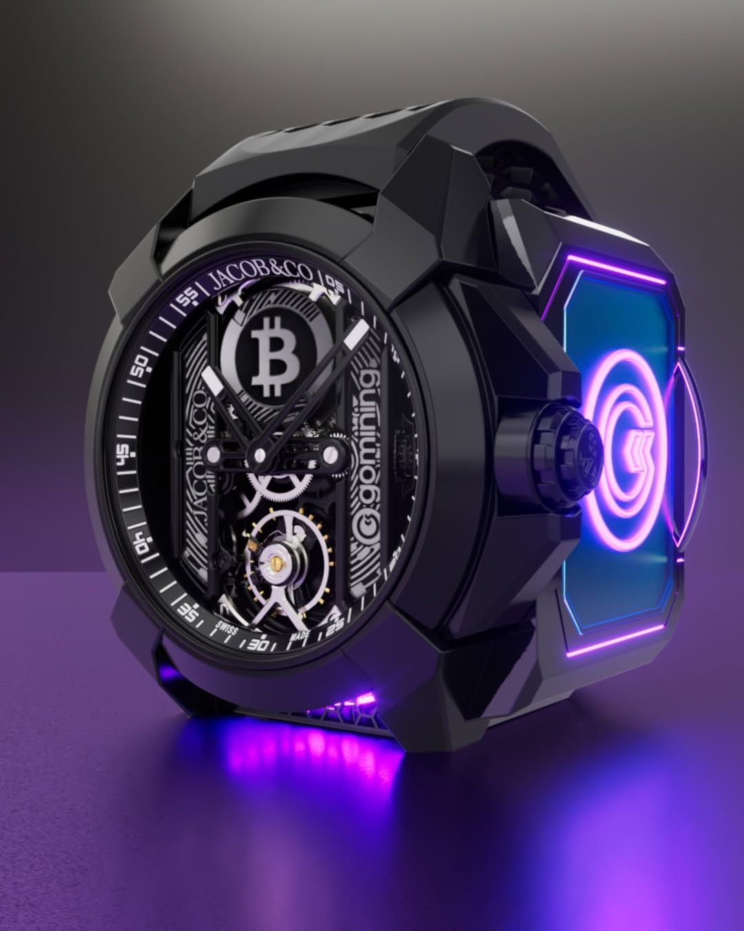 主打「極致浮誇奢華」路線的品牌Jacob & Co.打造頂級腕錶,以 Epic X 系列為基礎,採用了具有力量感的 44 mm的黑色 DLC 不鏽鋼錶殼,並保留了招牌的 X 型橋板設計。在視覺細節上,錶盤融入了受比特幣啟發的圖形圖案。可以讓你一眼看穿精密齒輪的運作,這跟比特幣強調的「去中心化、透明化」邏輯不謀而合。