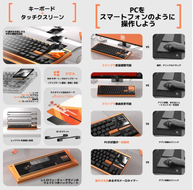採用 80% 的配列,觸控螢幕有 480 × 480 像素的解析度。使用者可以透過滑動或點擊螢幕來調整電腦音量、螢幕亮度、切換曲目,或是設定虛擬快捷鍵。此外,螢幕也能即時顯示 CPU 使用率、系統時間,甚至內建了「番茄鐘」功能,協助使用者分配工作與休息時間。
